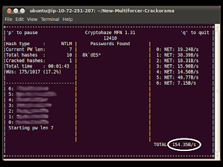 This is a run from a few weeks ago. It involved 6 machines, about 30 GPU cores, and an awfully fast attack on NTLM. We hit 154B NTLM/sec, and the code is even faster now than it was for that test. Please notice that this is NOT a single hash run – this is 10 hashes!