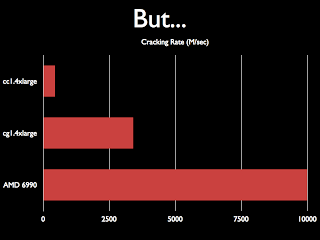 The first thing that usually comes to mind is Amazon’s EC2 GPU instances. Depending on who you believe, they are either the end of passwords as we know it, or they’re two ancient nVidia Teslas for $2.10/hr. I’ll be coming back to that later.